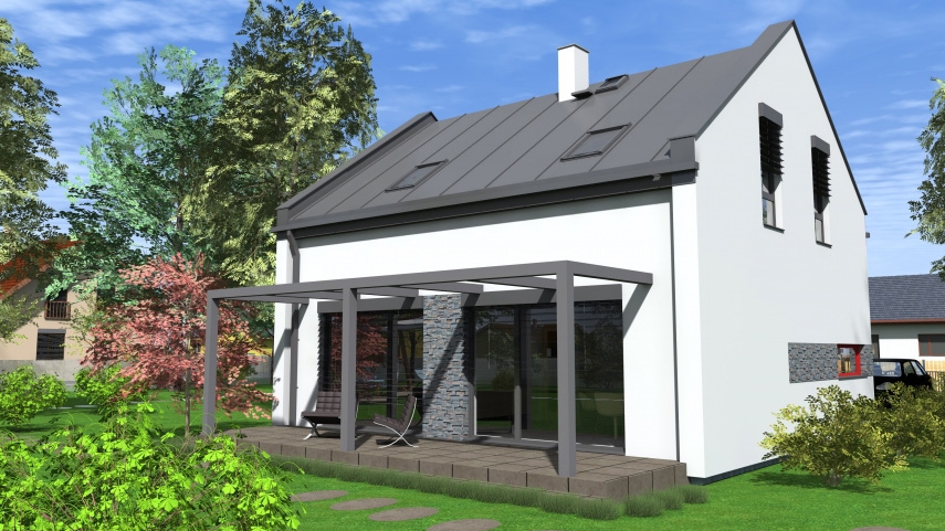 Další evergreen v naší řadě nejoblíbenějších domů! Moderní design, tvořený zvýrazněnými štítovými stěnami, které přecházejí v nadstřešní atiky, vypadá skvěle, že? K tomu přidejte praktickou a užitečná vnitřní dispozice domu, které sluší i terasa s pergolou. Není divu, že tento dům má hrdé místo mezi našimi typovými domy. Navíc může být přizpůsoben individuálním požadavkům, tak aby splňoval vše, co si noví majitelé budou přát - např. dřevěný trámový strop v kombinaci s krbem mení interiér obývacího prostoru a dodává mu vřelou a příjemnou atmosféru.